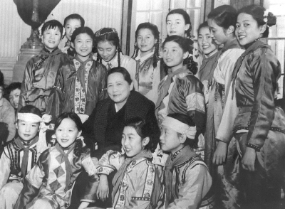宋奶奶经常来少年宫视察。每次她都要到处走一走,看一看,跟小朋友们聊聊天。这天上午,她在少年宫停留的时间格外长。她巡视了少年宫的各个团组。最后,她来到少年厅观看小伙伴艺术团的演出。节目演了一个又一个,有合唱,有独唱,有魔术,有朗诵……每看完一个节目,宋奶奶都高兴地拍手鼓掌。最后一个节目是由14位身穿民族服装的小姑娘表演的舞蹈《绣毛主席像》。舞蹈一结束,宋奶奶就笑咪咪地向小演员招手,小演员们争先恐后地跑过去,把宋奶奶团团围住。宋奶奶夸奖说:“你们跳得很好!很好!”她又问大家分别表演的是哪个民族,小演员们一一作了回答。宋奶奶点了点头说:“我们祖国是个大家庭,一个团结的大家庭,各族人民都热爱毛主席。”就在这时候,有人举起相机,抢拍下了这张象征民族大团结的“合家欢”。这张“合家欢”照片,成了少年宫舞蹈小组的珍品被仔细地收藏起来。宋奶奶亲切的笑容也深深地留在了孩子们的心里。