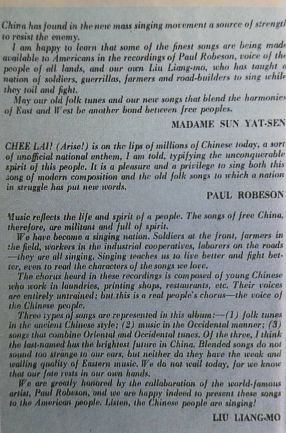 *唱片集《起来!》封套上孙逸仙夫人(宋庆龄)、保罗·罗伯逊和刘良模的题词