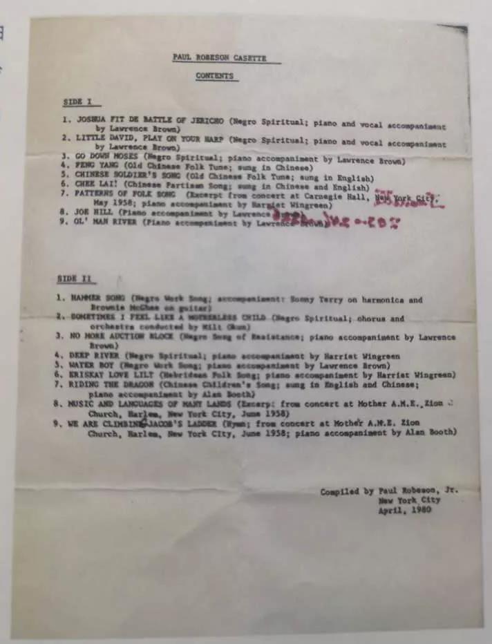 小保罗·罗伯逊提供给宋庆龄的保罗·罗伯逊歌曲录音磁带的曲目