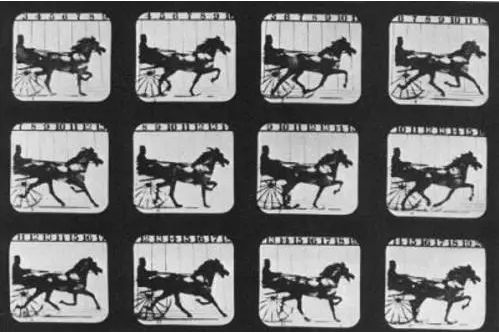 在跑道的一边放置了24架相机,排成一行,相机镜头都对准跑道。在跑道的另一边,他打了24个木桩,每根木桩上都系上一根细绳,这些细绳横穿跑道,分别系到对面每架照相机快门上。一切准备就绪后,摄影师牵来了一匹骏马,让马从跑道的这头跑到那头。当马经过这些区域时,依次把24根引线绊断,24架照相机的快门也就依次被拉动而拍下了24张照片。