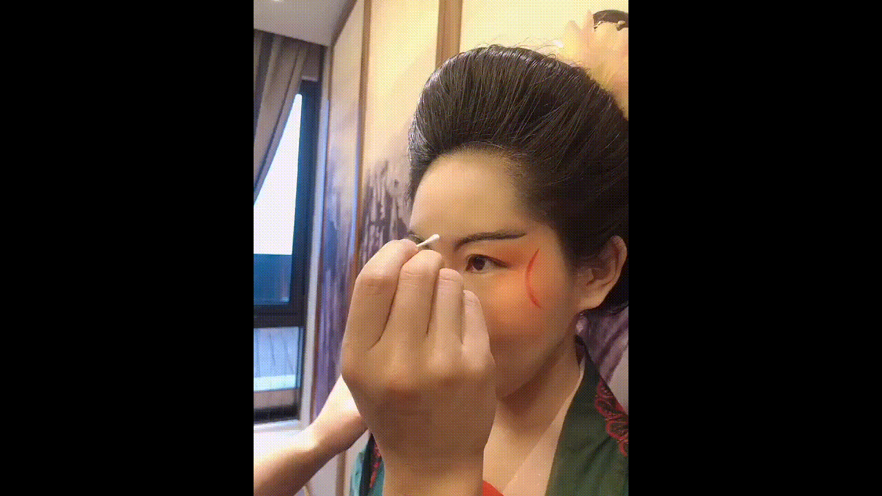 Tips: 如果担心画不好也没关系,小编偷偷告诉你,可以先在手背上画出你设计好的花钿图案,然后将画好的花钿举到眉心的位置印上去,再用画笔稍加调整,一个美丽的花钿就完成了。