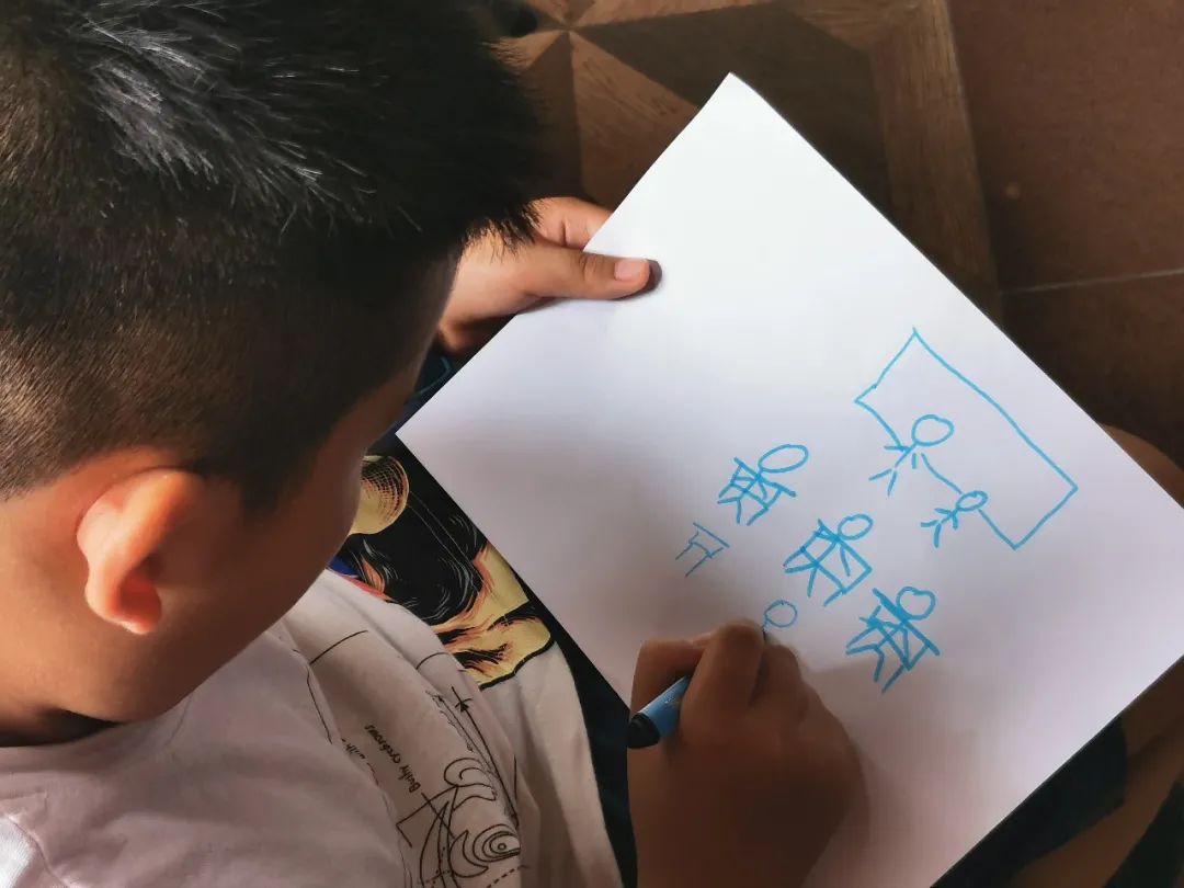 当老师启发同学们用绘画的方式表达可持续发展目标的时候,大家纷纷拿着纸和画笔,在地上勾画起来。龙龙画了一个男生一个女生,他说印象最深的就是性别平等,班级里的女生很优秀。