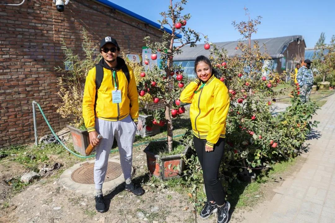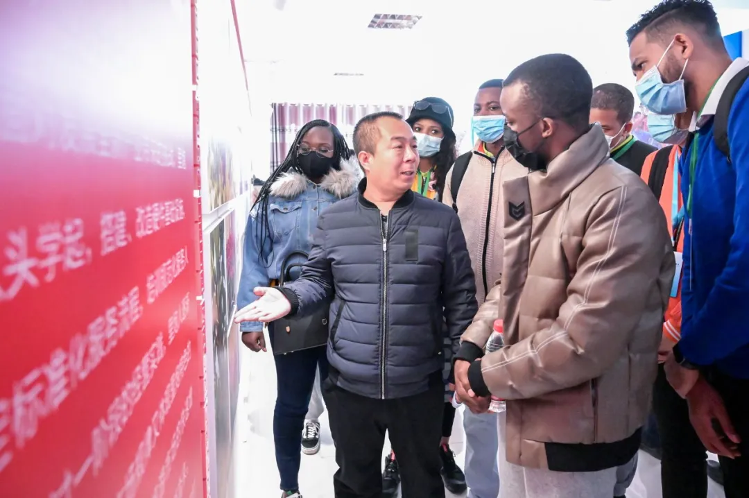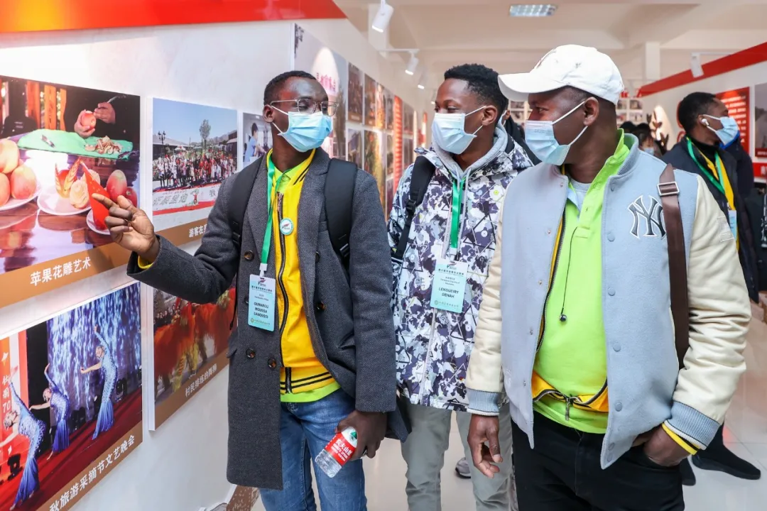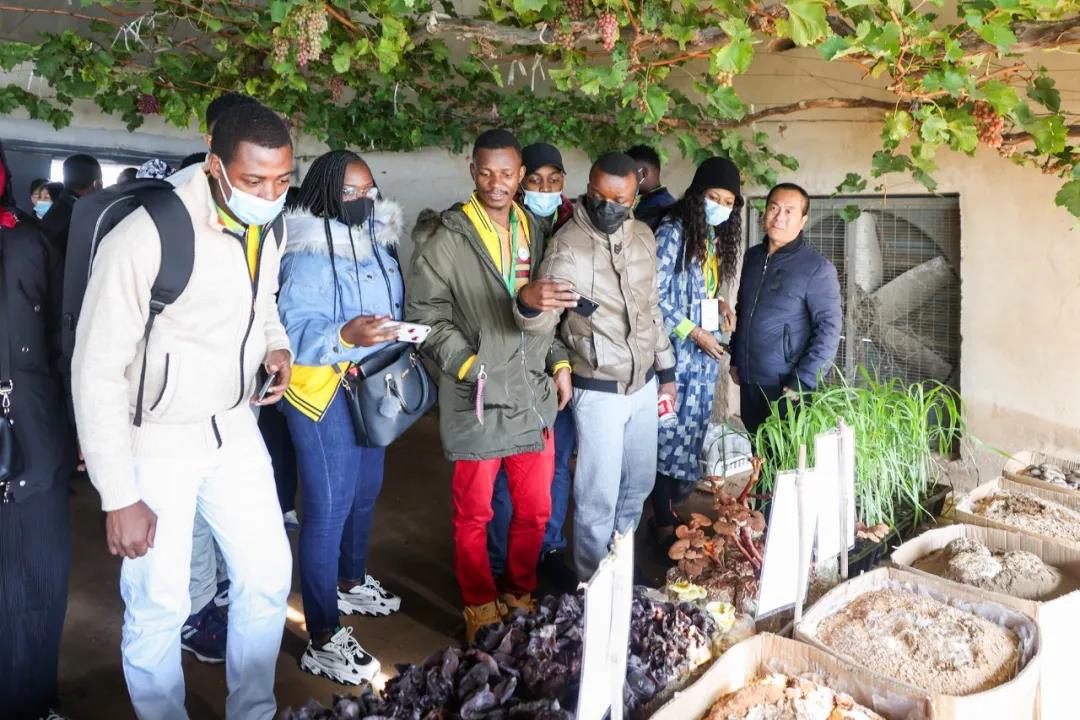 青年们首先来到里炮村村史馆参观。在村支部书记张恒的带领下,青年们从一张张图片、一件件实物中看到里炮村从昔日“南荒滩”上的两户土坯石窑,变成了今天的好山好水好生态、绿色发展“聚宝盆”,成为中国农村摆脱绝对贫困、全面建成小康社会的样板和缩影的光荣历程。随后,大家参观了里炮村盆景园艺示范园和园艺小镇。改良的矮种苹果树和栽种在花盆里的苹果盆景别具一格,引起大家阵阵惊叹,纷纷拍照留念,并仔细询问种植成本和市场前景。在菌草种植试验大棚,非洲青年们对“小而美、见效快、惠民生”的菌草技术非常感兴趣,不断向张书记提问,深入了解菌草种植的技术要求和经济效益,对菌草在脱贫致富中的独特作用留下深刻印象。
