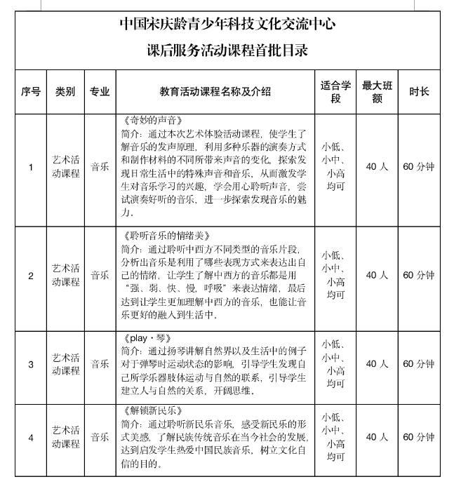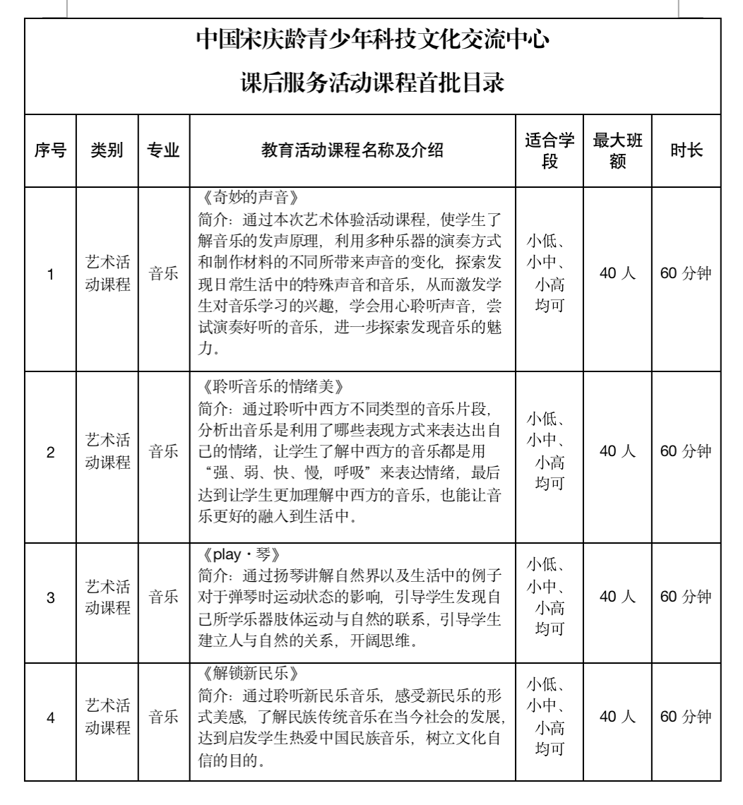 为落实立德树人根本任务,促进学生全面发展、健康成长,中国宋庆龄青少年科技文化交流中心作为青少年教育“实验性、示范性”国家级平台,坚守为党育人、为国育才,积极响应“双减”政策,发挥校外活动场所在课后服务中的作用,充分利用中心在专业师资、课程研发、资源平台上的优势,精心设计了艺术、体育、科技、中华优秀传统文化四大类走进学校面向中小学生课后服务的活动课程,首批活动课程共50个,期待与更多中小学校深度合作。