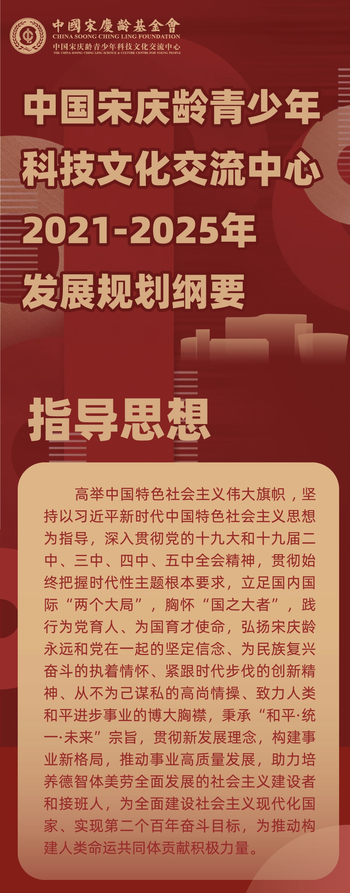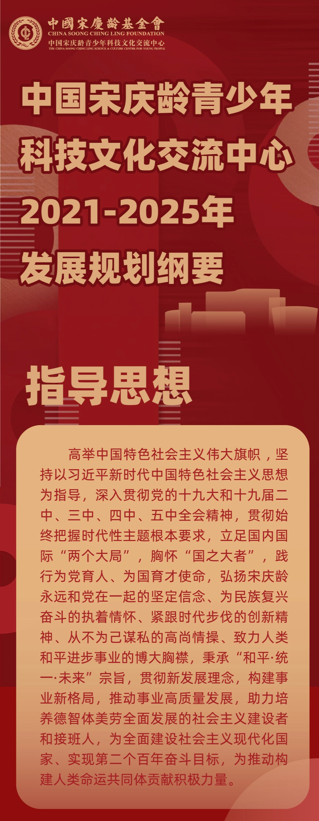 近日,《中国宋庆龄青少年科技文化交流中心2021-2025年发展规划纲要》(以下简称《中心规划纲要》)正式发布。《中心规划纲要》旨在遵循习近平总书记关于始终把握时代性主题的重要指示要求,深入贯彻中央精神和国家相关政策、法律法规,全面落实中国宋庆龄基金会(以下简称基金会)工作部署,大力推动中心事业在新阶段进一步提质增效、行稳致远。《中心规划纲要》在全面梳理现实条件、分析发展形势的基础上,提出了中心在“十四五”期间事业发展的指导思想、发展目标和重点任务。