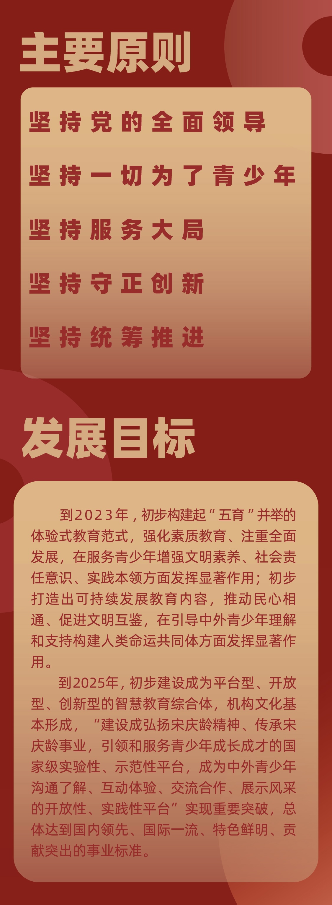 《中心规划纲要》明确中心将围绕立德树人根本任务,坚持稳中求进工作总基调,着力提高事业发展质量,努力建成为党育人、为国育才的青少年红色教育阵地。到2023年,初步构建起“五育”并举的体验式教育范式,强化素质教育、注重全面发展;初步打造出可持续发展教育内容,推动民心相通、促进文明互鉴。到2025年,初步建设成为平台型、开放型、创新型的智慧教育综合体,机构文化基本形成,总体达到国内领先、国际一流、特色鲜明、贡献突出的事业标准。