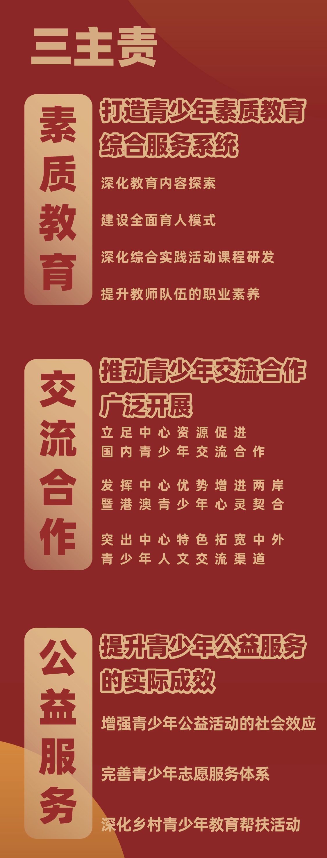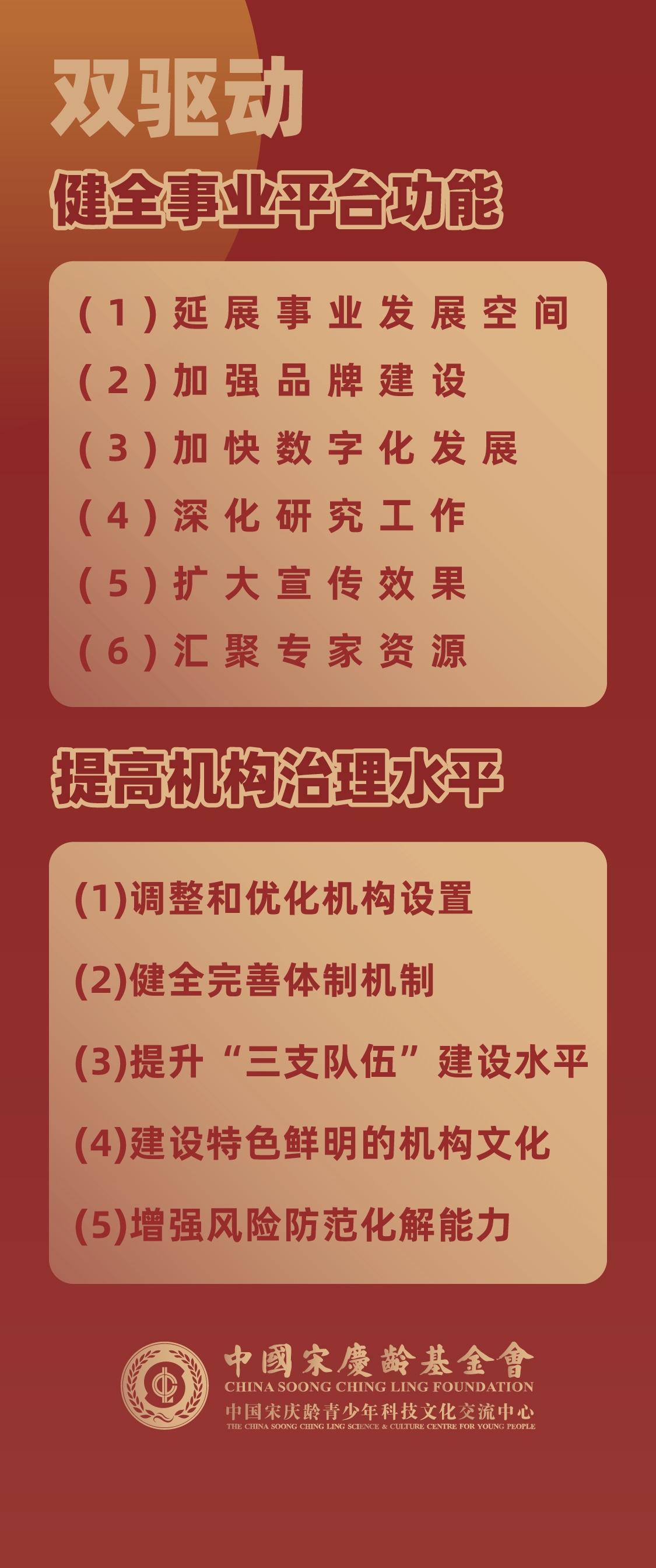 《中心规划纲要》提出将构建“一引领、三主责、双驱动”事业格局,并据此统筹安排未来五年的重点任务。“一引领”是坚持党的政治引领,坚定宋庆龄青少年事业发展方向,着重深化机构政治建设、提升服务大局能力、加强青少年思想引领;“三主责”是做好青少年的素质教育、交流合作与公益活动,着重打造青少年素质教育综合服务系统、推动青少年交流合作广泛开展、提升青少年公益服务的实际成效;“双驱动”是通过健全事业平台功能、提高机构治理水平,为规划纲要的实施增强动力、提供保障,前者主要包括延展空间、打造品牌、数字化发展、深化研究、加强宣传、汇聚专家资源,后者主要包括改革机构、完善体制、建设队伍、打造机构文化、增强风险防范化解能力。