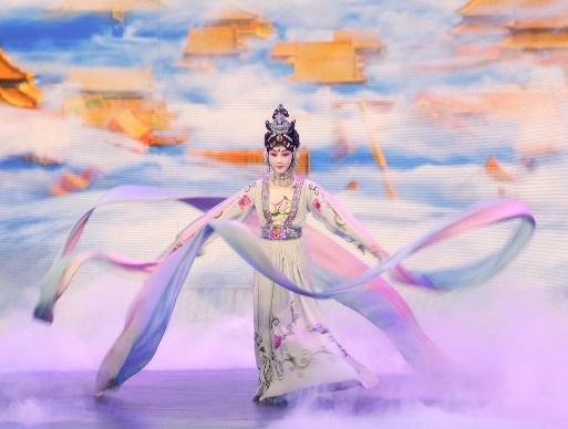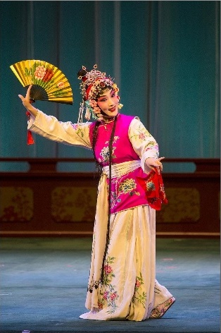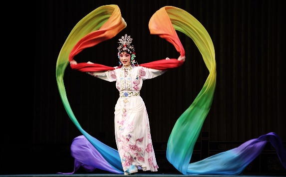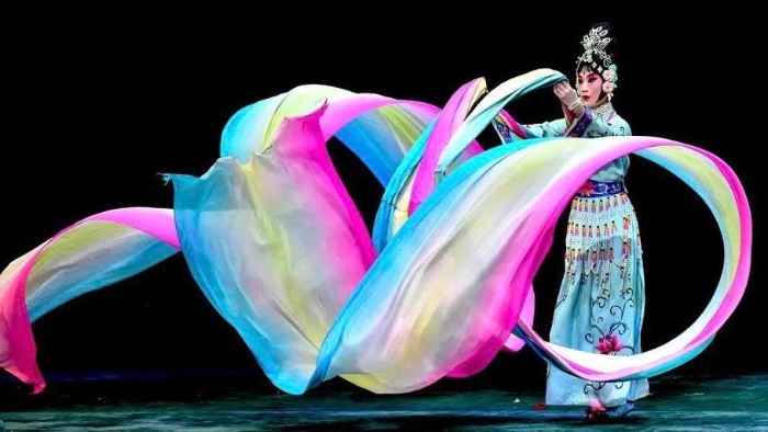 《天女散花》全剧共六场,重点为“云路”和“散花”,古装造型华丽、唱腔悦耳、身段韵美,两条彩色长绸飘飘然,在舞台上表现着天女御风而行的优美华丽。