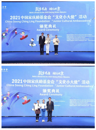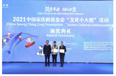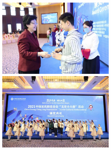 2月16日,2021中国宋庆龄基金会“文化小大使”活动颁奖典礼在京举办。全国政协副主席、中国宋庆龄基金会主席李斌出席活动并向获奖“文化小大使”代表颁奖。文化和旅游部副部长张旭,北京市政协副主席、中国宋庆龄基金会副主席、北京冬奥会开闭幕式工作组组长王宁,中国宋庆龄基金会常务副主席杭元祥、副主席于群,中国新闻社社长陈陆军,中国对外文化集团有限公司董事长李金生等出席活动。