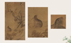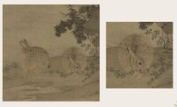 崔白的绘画风格是很清雅的,这张《双喜图》有机结合了自然形象的生趣与生命的生机。整张画面有一种宁静高远的感觉。通过观察可以发现在这张画中形成了一个从上到下的S形。这个S形并不是一个简单的形状,它实际上是一种曲线和律动感,而且S形的上方有很多不同的物体,交织组成了一种有生命力的画面。这张作品的左下角是野兔,通过放大版的画面可以发现崔白在画这只野兔的时候用笔很细致。他把兔子的毛发分成绒毛、鬃毛、还有皮,不同的部位以不同的线条去表现,展示出了兔子很生动的形象特征。