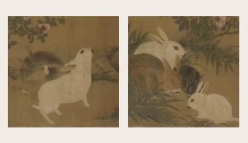 这一张是元代钱选的《玉兔小鸟图卷》。画面中是大家生活中常见的红色眼睛、白色身体的兔子。作品中把很多种兔子的形态都画出来了,例如有立起来的、有往上眺望的、有蹲在地上的显得很胆小,还有几只兔子聚在一起吃东西的,画得细致生动。
