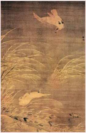 《苍鹰攫兔图》是明代张路的作品。这幅作品看上去是平面的、静态的,但实际上充满了动态感。作品描绘的是苍鹰扑击野兔的瞬间,苍鹰凌空倒悬正在往下俯冲,野兔在拼命地逃跑,从画作中能感受到紧张的氛围。通过背景茅草的动感,我们能够感受到风刮的方向,让画面的氛围也变得更紧张。作品用淡墨的背景和留白衬托出了茅草飞扬的场景,用笔逼真,充满意境!