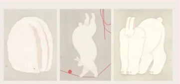 李戬的作品充满一种宁静感,是工笔作品,色调更加淡雅。他在创作中把兔子做了变形,特别有趣。左边的作品把兔子整体变成一个椭圆形,但是基本特点都融入其中。中间的作品是头倒过来,像走高跷一样。