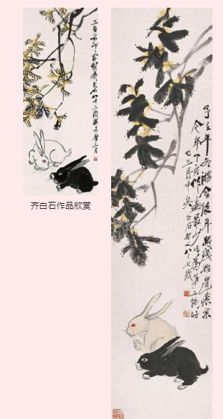 齐白石画画注重作品的真实性,他十分喜欢观察生活,也依靠生活中的感受和经验来创作作品,喜欢创作我们耳熟能详的事物:虾、蟹、花都成了他笔下的创作对象,在这些动物中,齐白石对兔子的感情颇为独特,他为了画好兔子,曾养了数只黑白兔子,常常仔细观察他们的生活习性及细微动作。在观察的基础上,他创作出了一批精彩传神的兔子画。