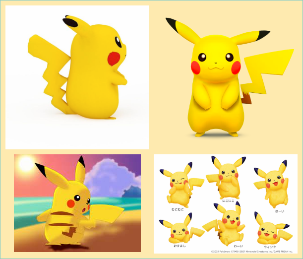 多角度的图片素材有助于我们进一步理解造型,通过观察可以看出,皮卡丘形象的身体是圆柱体,胳膊和脚的部分是小圆柱体,尾巴为有厚度的片状。对皮卡丘角色图片的造型分析为下一步制作奠定了基础。