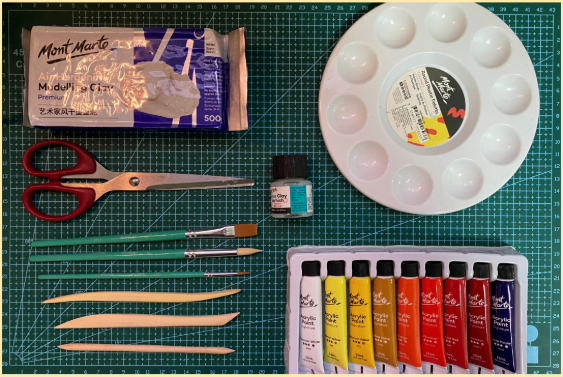 石塑黏土、剪刀、笔刷、雕塑刀、调色盘、丙烯颜料和亮光油。