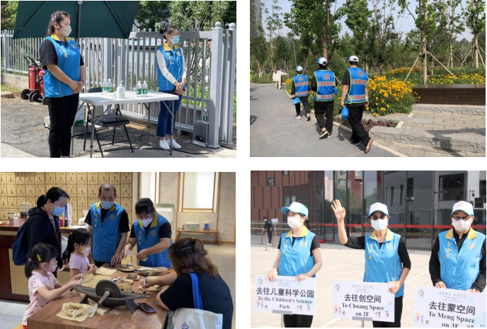 “今天公园有儿童活动,大家可以参观游玩。小朋友较多,为了安全起见,请把车子放外面,谢谢您的配合......”负责安全巡视的志愿者劝导着前来游玩的家长。82名社会志愿者和35名员工志愿者担负起公园外围及公园内的安全保障、文明引导、课程物资的准备等工作。应急救援志愿者携带急救包不停巡视户外儿童公园,以防天气炎热所出现的高温反应和户外意外伤害的发生。