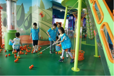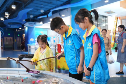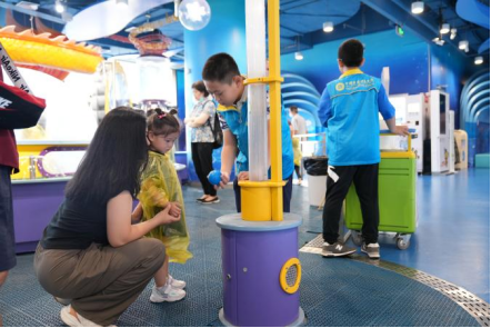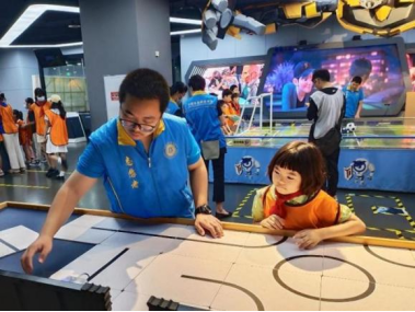 志愿者寮袁赫为小朋友介绍不同项目的体验方法。