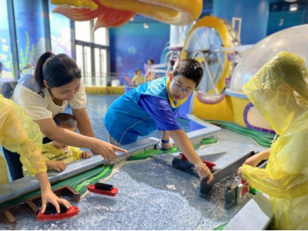 姜依晨与薛佳馨引导小朋友体验离心力转盘。
