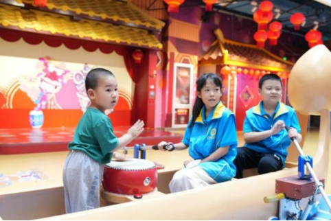 侯博文与厉邱予一起和小朋友参加“赛龙舟”。
