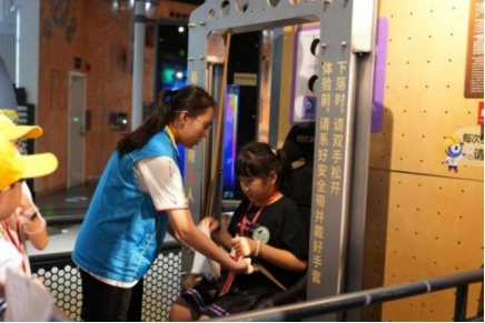 青少年志愿者队伍中的大姐姐孟湘晰、金怡果,担负起保障小朋友安全的职责,为体验者系好安全带,做好保护措施。