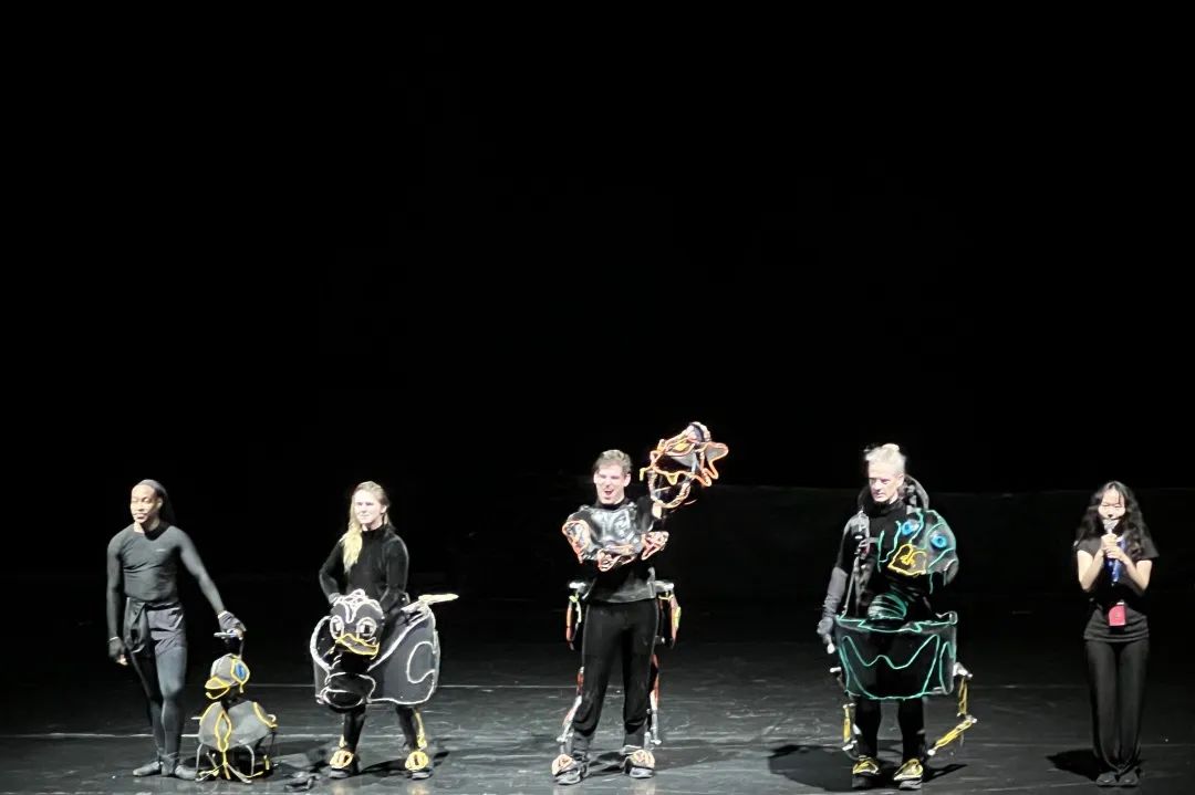 大猫咪在舞台上的表演可谓是栩栩如生,如同真的猫咪一般,动作妖娆、捕猎精准,还有闪电般的速度。这都要得益于猫咪形象的制作,制作中采用鱼线与废弃灯牌结合在一起,实操起来更方便。