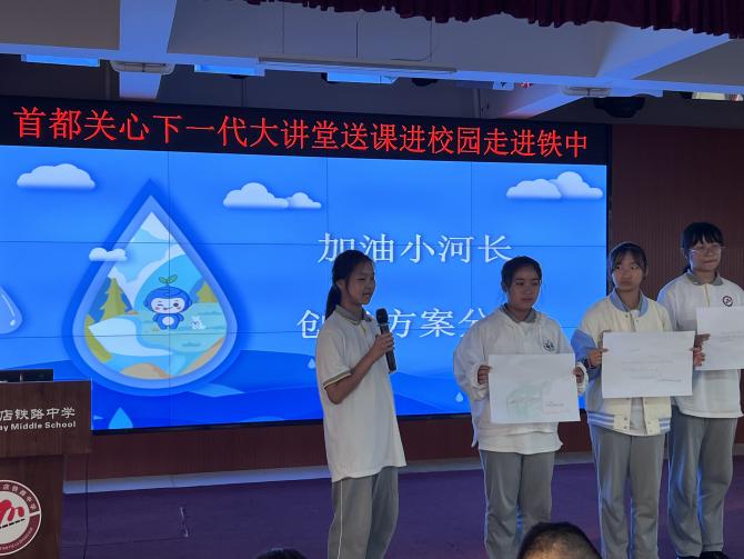 9月14日,为进一步发挥“首都关心下一代大讲堂”平台优势,助力青少年全面发展,由中国宋庆龄青少年科技文化交流中心提供的《建设幸福河湖我参与》活动课程走进三家店铁路中学,为近百名青少年开展了一节保护河湖主题的创意思维课。