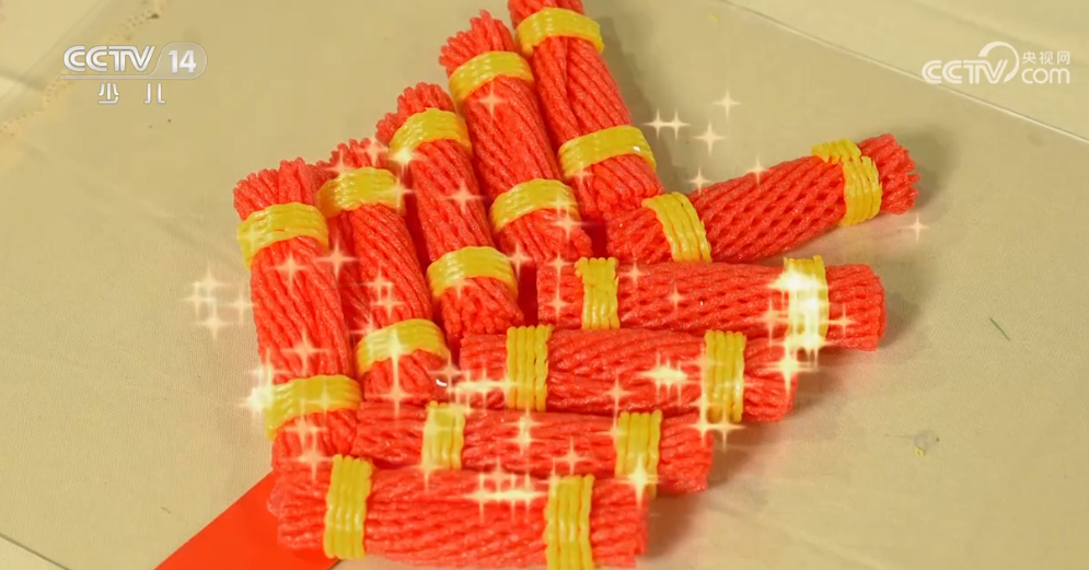 第一步:准备一个红色水果网套,剪成四小块,每一块卷起来用双面胶固定,形成一个卷筒。