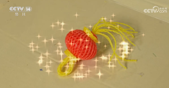 第五步:从黄色水果网套上剪成条形,用双面胶贴在灯笼两头扎皮筋处。再粘上提把和穗头,一个灯笼就做好啦!