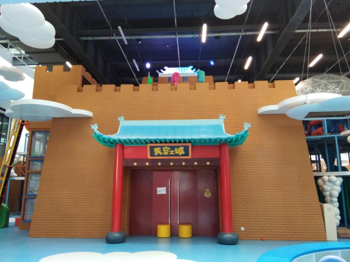 本次拍摄取景于中心三层蒙空间天空之城主题区,小朋友可自由穿梭于城墙之上,体验攀爬、堆积城砖、修复城墙等项目,从不同角度,纵观天空之城美景,了解中国古代建筑的独特魅力。