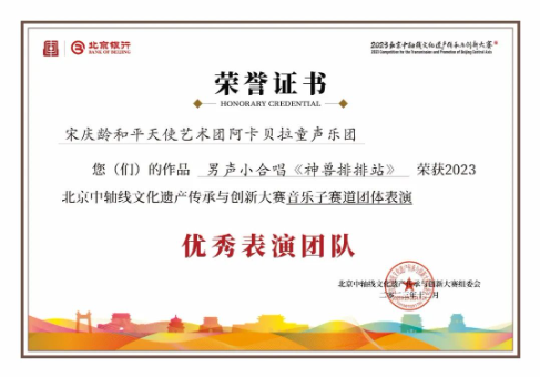 在2023北京中轴线文化遗产传承与创新大赛音乐子赛道中,宋庆龄和平天使艺术团阿卡贝拉童声乐团的小学员们表演了《神兽排排站》与《北京天坛》。孩子们饱满的热情、专业的技巧和美妙的歌声,打动了评委和观众,最终在众多优秀的团队中脱颖而出,荣获了优秀表演团队奖项。