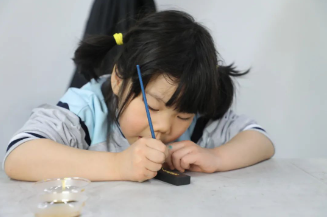 在墨块描金的活动现场,小学员们聚精会神地围坐在桌前,手持笔刷,蘸取金粉,小心翼翼地在墨块上描绘。