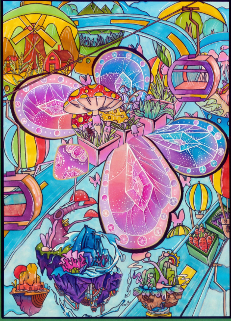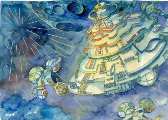 科学家们利用科学技术将地球上的植物种子和动物幼崽等通过星际蝴蝶运输车、星际生态球、星际生态岛屿等运送到太空,协助改良动植物的品种,更高效地实现地球与各星球间的各种能源、能量的输送与转换。不久的将来,太空上的星际飞车可以随时在各个星球之间来回输送各种能源、植物等,蝴蝶的翅膀也为天空增添了许多色彩,旁边的几只机械蝴蝶具备美化环境的功能。生态球适合不同品种和生态环境的农作物更好地成长,生态岛屿可以美化天空的环境,还可以净化空气,让空气不受到污染。星际缆车、星际热气球可以方便地球上的人们去各星球自由参观和旅游。未来,人们将拥有充满希望和梦想的宇宙环境。