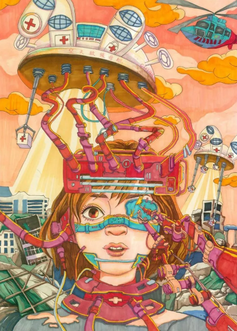 2050年,中国科技取得了举世瞩目的发展,为了守护人民群众的生命健康安全,空天救援母舰应运而生。空天救援母舰可以在自然灾害、战争以及应急事件发生的第一时间到达救援现场。空天救援母舰通过抛下救援舱将伤员转移至母舰上的医院进行救治,母舰上配备了先进的医疗机器手臂,可以直接对伤员进行手术;母舰上还拥有停靠直升机的停机坪,可以承担空中搜救、巡逻、运输等任务。一位头部多处受伤的小女孩正在救援母舰上的医院接受治疗,先进的医疗机器手臂为她进行手术,目前其伤情已得到有效控制,并且直升机在第一时间将她安全转移至具备更全面医疗条件的医院。我相信,我们的国家一定是第一个拥有空天救援母舰的国家。