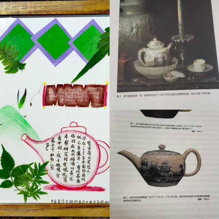 来自天通苑小学的杨念许同学创作的茶画与荷兰画家彼得•范•罗斯特拉坦1695年的静物油画一比一呼应,并且与英国最早生产瓷器茶具的厂家之——鲍陶瓷厂1752—1755年间生产的青花瓷壶廓形神似。杨念许同学此前并没有见过西方作品,在这次研学创作中,体现了他的艺术天赋。