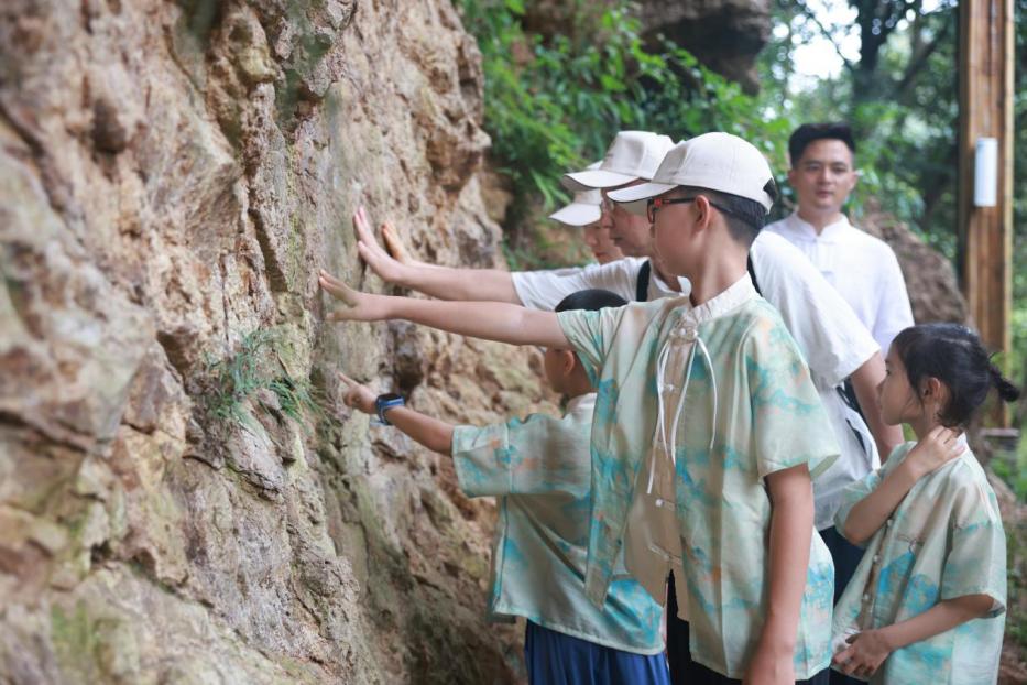 随着营期活动的深入,亲子家庭的营员们兴致勃勃地前往了历史悠久的顾渚最高堂摩崖石刻。这是一处承载着丰富文化遗迹的地方。亲子营员们在石刻前驻足,阅读着千年前杜牧留下的诗文,感受着古人对茶的热爱和对生活的执着。