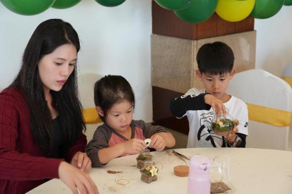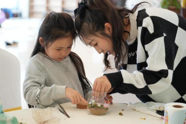 来到森林精灵部落,小营员了解了森林对于生态平衡的重要作用,并亲手制作苔藓微景观瓶,每一片苔藓、每一粒石子都承载着他们对自然的热爱与尊重。