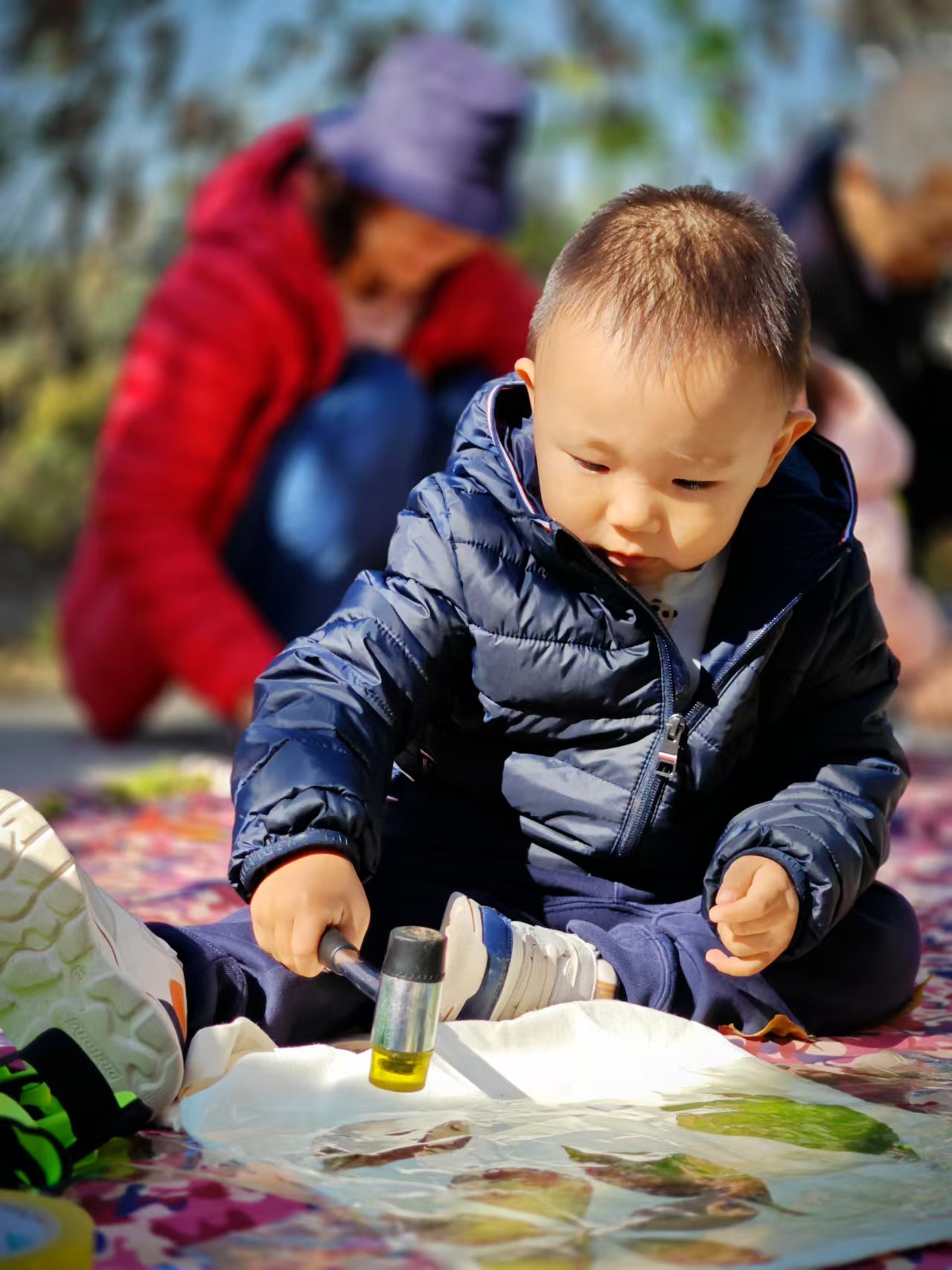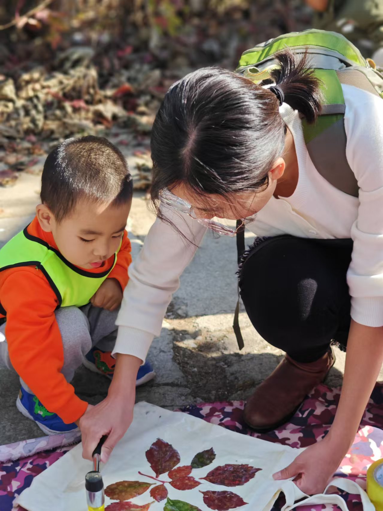 孩子们拿起五彩斑斓的植物叶片,在布袋上进行花草拓印。他们专注而认真地创作,将秋天的色彩与图案定格在布袋上,留下了对秋天的美好记忆。