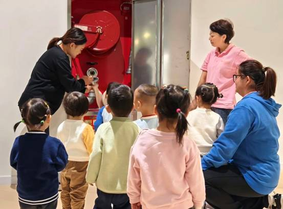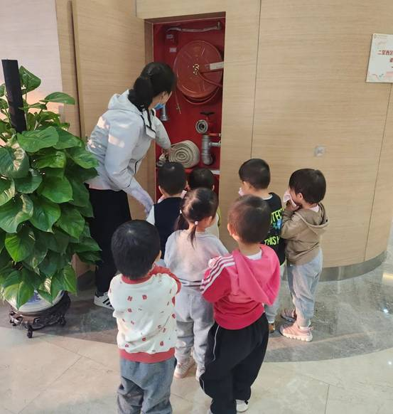 教师和幼儿共同寻找园内的消防器械。通过观察实物、演示操作等方式,将消防栓、灭火器等消防设施设备一一呈现在幼儿面前。展示过程中,教师详细地讲解了消防器材的功能,并演示了正确的操作方法,给孩子们上了一节生动的消防安全课。