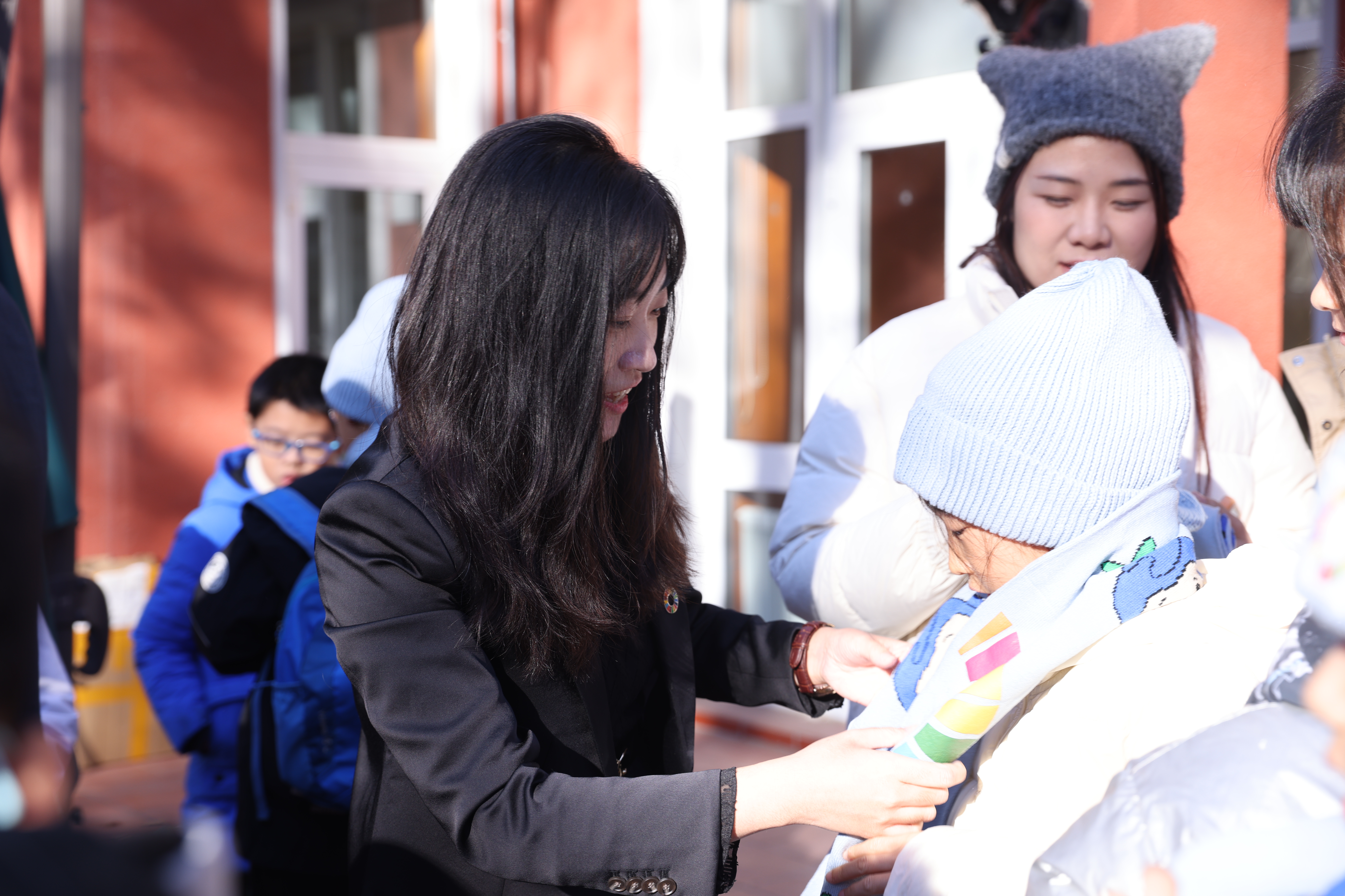赵军主任和张楠主任为青少年志愿者们系上标志可持续发展和志愿精神的围巾。