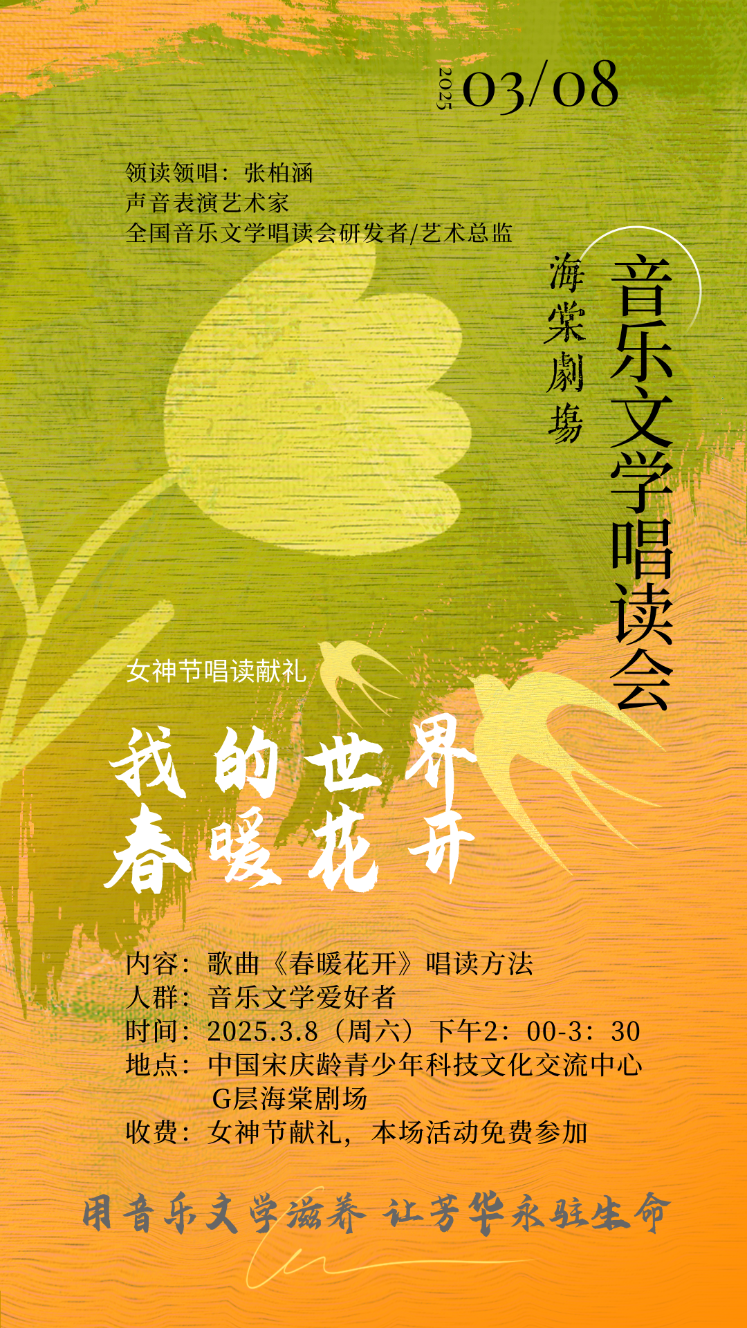 本次唱读会将以歌曲《春暖花开》为核心,带大家深入了解歌曲背后的创作者以及创作背景,逐句分析歌词含义,在朗读中感受文字的力量。同时,专业老师将现场指导,传授演唱技巧,教大家如何用歌声传递情感。此外,还会有歌唱表演方法的教学,帮助大家在舞台上自信绽放,用表演诠释歌曲魅力。