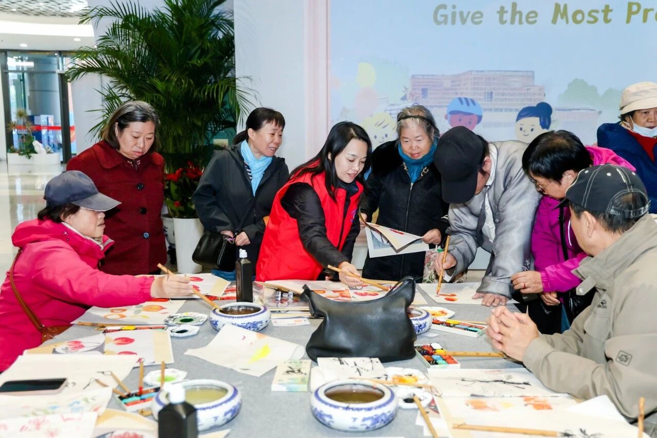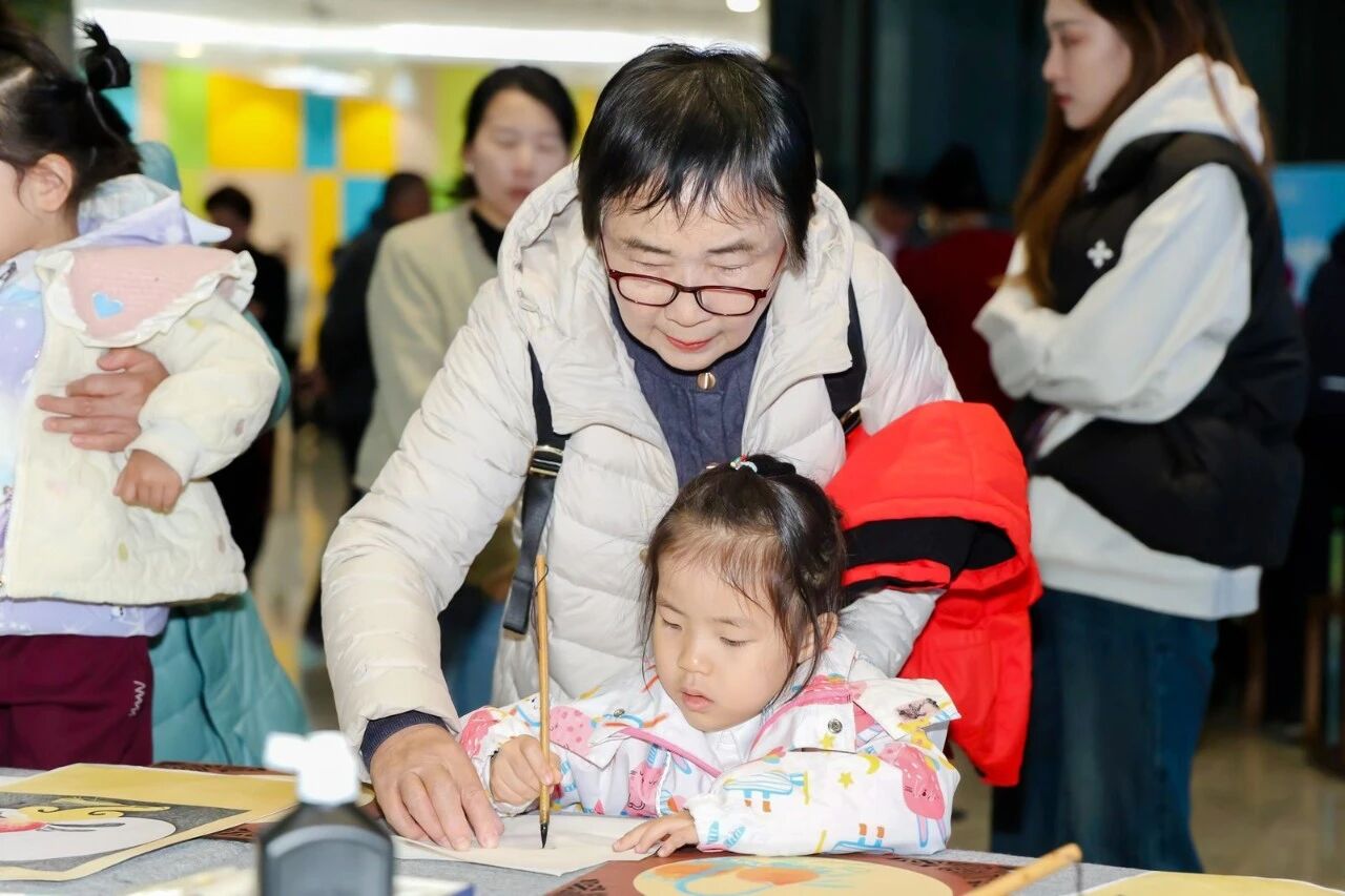 中国宋庆龄青少年科技文化交流中心(以下简称“宋庆龄青少中心”)一层中庭,铺着素色宣纸的长桌旁,63岁的靳文虎握着孙子靳翊言小朋友的手,共同绘制一幅秋日花卉图,“来,宝贝,感觉笔在走路。”爷爷的声音低沉而温和。毛笔落下,墨色在纸上晕开,“一老一小”相视而笑的画面,成为10月21日“银龄精彩・共育未来”宋庆龄青少中心“敬老月”主题日活动中最动人的一幕。在重阳佳节到来之际,2400 余名银龄老人与孩子携手,在笔墨丹青与欢声笑语中,共赴一场融合传统文化、智慧科技与艺术体验的终身学习盛宴。